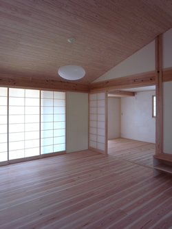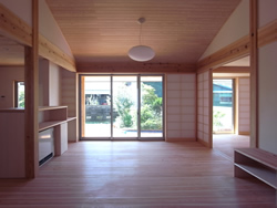 軒を低く、また1200mmと大きく伸ばし、出来るだけ落ち着いた空間にしています。