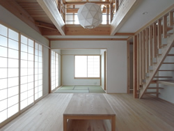 敷地は南側に開けており眺望もよい為、南側に大きな開口を設け、OMソーラーを採用し居間に吹き抜けを設けています。