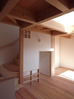 敷地形状・居間の配置・駐車場からL型のプランとしました。無垢の梁組をみせる空間構成を狙い、直天井としています。