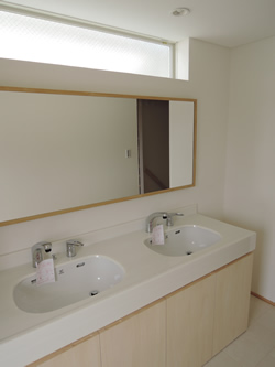 2階に寝室と水廻りを設け、ダブルボウルの洗面・家事コーナーから南側のデッキに出られます。
