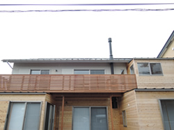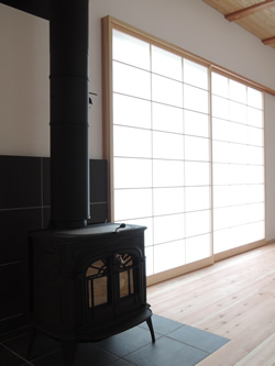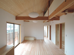 南側に間口の広い敷地の60坪のOMソーラーと薪ストーブのある二世帯住宅です。車通りが多い為、西側の玄関と駐車場として南面は木塀で目隠ししています。