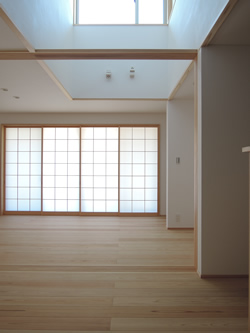 LDを用途に応じて仕切れる様に、天井いっぱいの障子を計画しながら、普段はピアノ脇に収納できるような計画にしています。