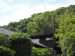 敷地は5m道路より約20m引き込んだ竹林の袂にあります。南側には古い平屋が建ち、庭の桜が見えます。