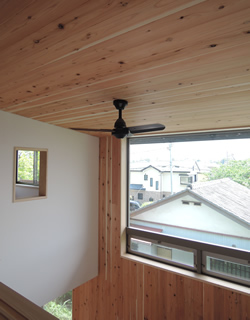 内部にも板壁・板天井を取り入れ、珪藻土の白、お施主様の家具の色との調和を図っています。