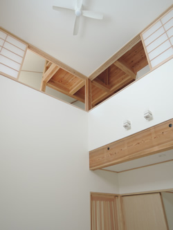 バリアフリーの設備を備えながらも、障子や吹抜、直天井のロフトの木の素材や梁などが見え、視線のバリアフリーにもこだわった住まいです。