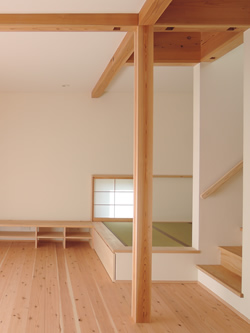 他、小上がりの畳スペース兼書斎コーナー、2階とつながるスノコ廊下、趣味のロフトスペースもあり、ふんだんにプランに盛り込ませて頂きました。