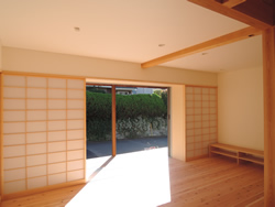 土間収納のある玄関、造作キッチンなど、プラン・家具にこだわりました。さらには、南面に全開放サッシに引分障子・本棚を造作で組合せた大開口を用意しました。
