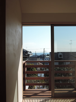 2階から海が臨めます。プランとしましては、土地の広さに比較的ゆとりもありましたので1階リビングとしました。