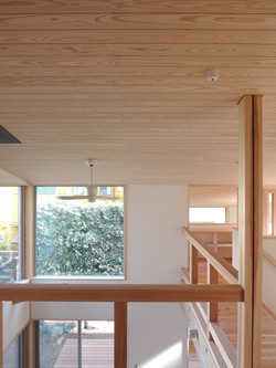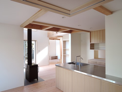 プランとしては、雁行プランの特徴を生かすように、玄関から居間に入った際、雁行した一番奥が見通せるように動線も含めて考えています。薪ストーブを導入したことで吹抜を4.5帖つくり、家全体が暖まるようにしています。