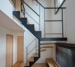 道路側は木塀とデッキの中庭、LDを挟んで、中央に植栽の中庭、和室を挟んで東側の光庭としています。外観としては、袖壁でプライバシーを確保しながら意匠的にも特徴付けて、緩勾配の屋根を架けています。