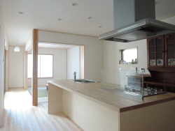 母屋と将来的につなぐことも考えた住まいです。南北に細長い建物となる為、出来るだけ広がりのある設計しています。ビルトインガレージもあり、その脇をアプローチして、木製の玄関引戸から入ります。キッチンは木製カウンターのアイランド型として、奥の和室まで見通せるように開放的にしています。2階は寝室3部屋と納戸、水廻りとフリースペースとコンパクトながら居場所のたくさんある住まいです。