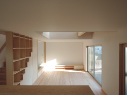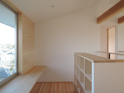 敷地は高台にあります。南側は道路を挟んで、住宅が建ちますが採光は十分です。西側は駐車場、北側に景色が広がります。立地を生かしつつ、ご要望を組み込み。切妻屋根の西側を道路側に伸ばし、ビルトインガレージ、ロフト、バルコニーを配置しました。