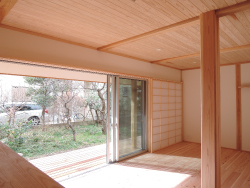 茅ヶ崎市内の住まいです。既存の植栽を生かしながら、配置と建物形状を検討しました。シンプルに総二階の切妻屋根と、1間幅の大きなデッキ上に奥行1間の下屋を架けた構成としました。内部はシンプルな真壁の柱、梁を表した意匠としています。2階も将来の住まい方に対応できるよう、間仕切壁は少なく考えています。