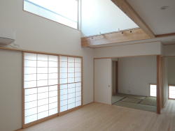 2015年に竣工しました茅ヶ崎市G邸(東棟)の隣に建ちます。間取りは違いながらも、外観に統一感があるように組み立てています。リビングには吹抜のある大空間が広がり、シーリングファンで空気を回しながら、障子で2階廊下と仕切れるようにしています。