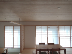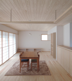 車通りの多い道路に面することから、東側は壁と玄関廻り配置、内部はLDKと和室の一体空間です。道路からのプライバシーの確保も考え袖壁を持つ家にしています。開口部には引き込める障子を使い、和室との仕切りは上部OPENとして開放的になるように努めています。2階は寝室群と書斎、納戸の構成。