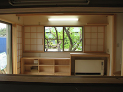 あったか家族の若世帯とお母さんの住まいです。南西側が庭と隣地の畑に開放され、既存の梅ノ木がなんとも言えない姿で立っていました。これは活かしたいと、梅ノ木側にファミリールームを配置し、額縁のように見える窓を設けました。