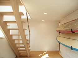 鎌倉の稲村ヶ崎は、周囲に昔ながらの路地が多く残っています。敷地もその一画にあります。周囲がとても静かで海、山の景色も楽しめる、また、趣味のサーフィンと住まいが直結するようなL字型のプランを考えました。海と山の景色をふんだんに取り込めるような天井までの窓、ダイニングから連続する1間幅の奥行きのデッキ、スキップフロアのリビングダイニングなど、いろいろな楽しみを持つ住まいになりました。