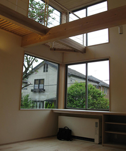 鎌倉の古い住宅街に立つ大きな八重桜。今回の住まいのテーマはこの桜とタイル!!焼き杉レンガ風の外壁タイル、その玄関から居間に入ると見上げる吹き抜けその先に見えるのが桜の木。外観からは思いもよらない内部の木のやさしい空間。大きな吹き抜けと対にした、低い天井の和室。風が抜け、気持ち良い落ち着いた空間になりました。