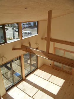 施主の要望は天井の高い大きな部屋。その答えとして考えたのがこのテーマ。1階から2階につながる勾配天井の大空間。それを支えるのがOMソーラーです。趣味を生かした土間玄関、そこから引き戸を開けるとこの居間です。隣接した個室は天井を低くし、将来は1階だけでも生活できるようにしています。