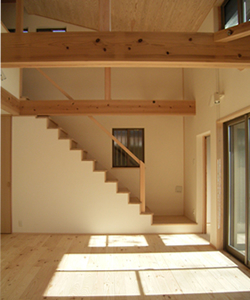 勾配天井の居間の奥に見える階段はきっと上り下りが楽しいはず。1階だけで生活…と言わず、ずっと2階も使って下さいね!!