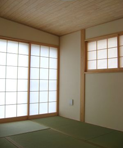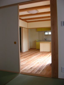 すべて真壁、壁は珪藻土という昔ながらの住まいです。1階和室と玄関部分を平屋(下屋)にして、LDK+水廻り部分が2階建ての構成。