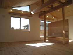 唯一、2階居間のシンボル柱2本と梁、勾配天井の杉板に木を現し、温かさを表現しました。