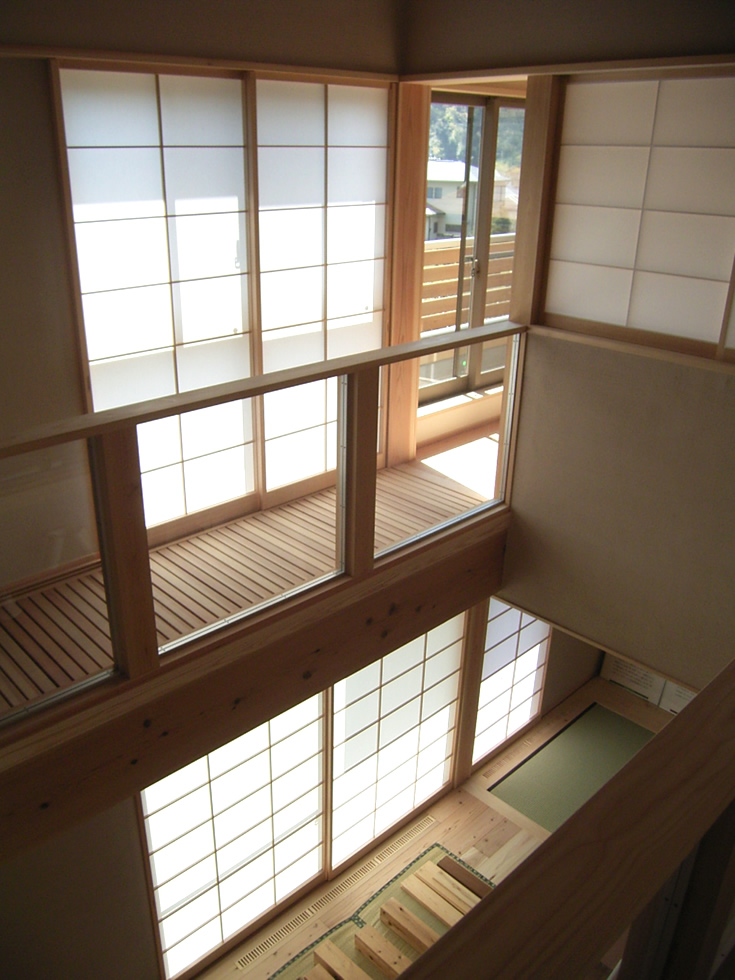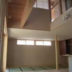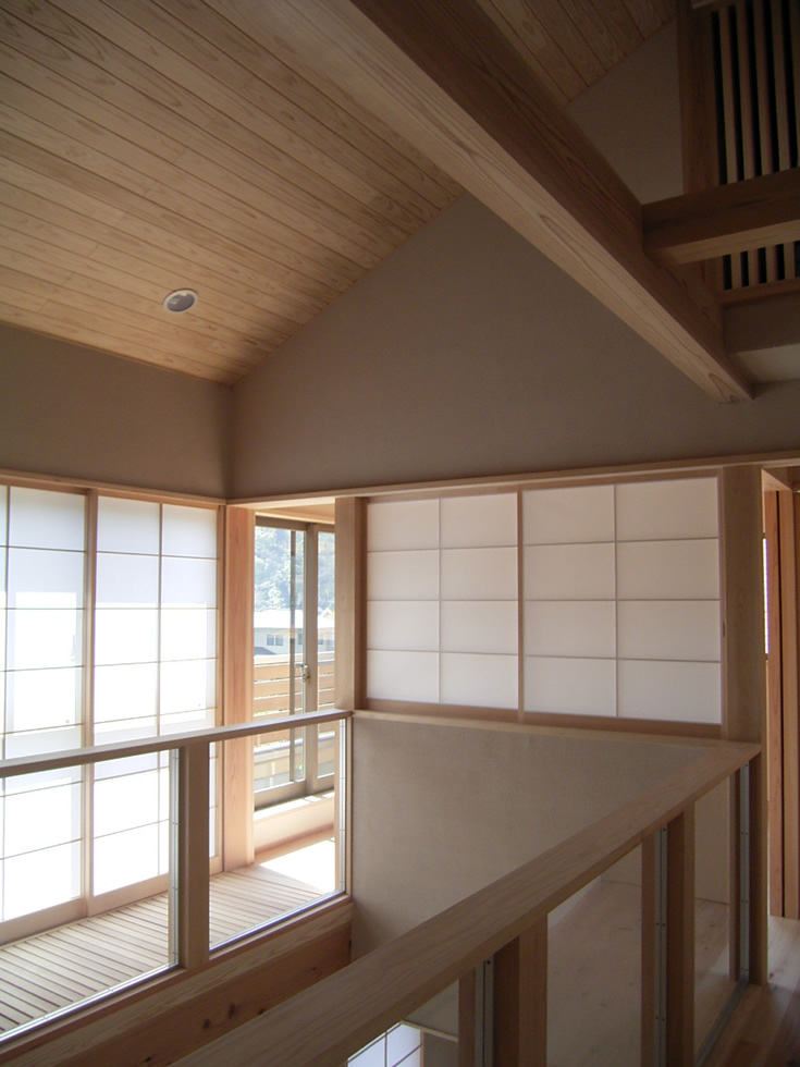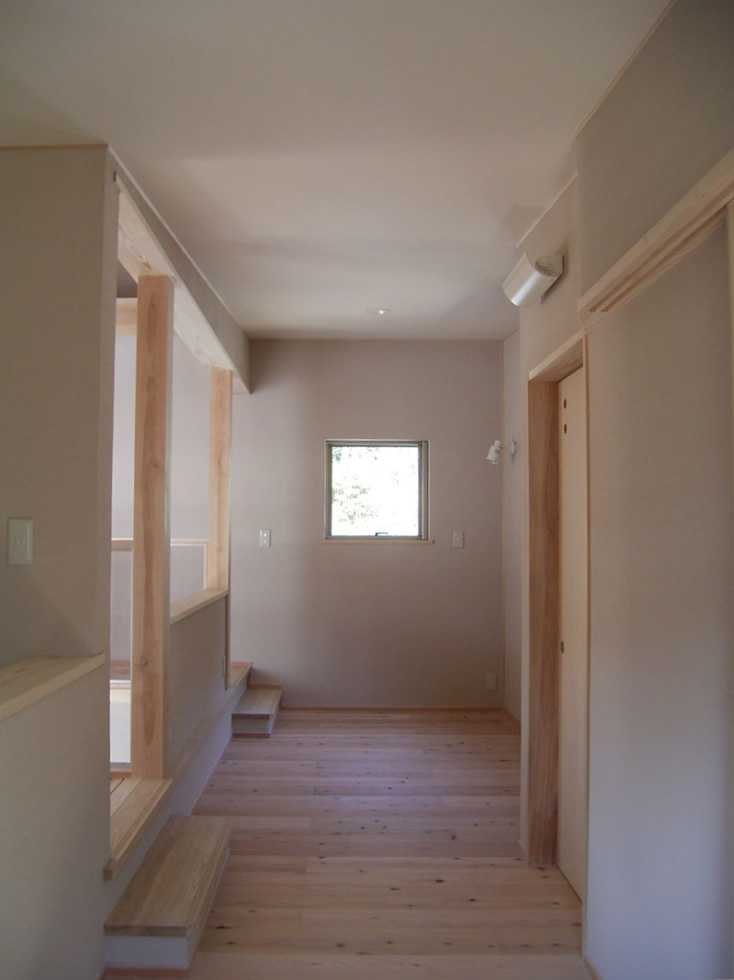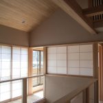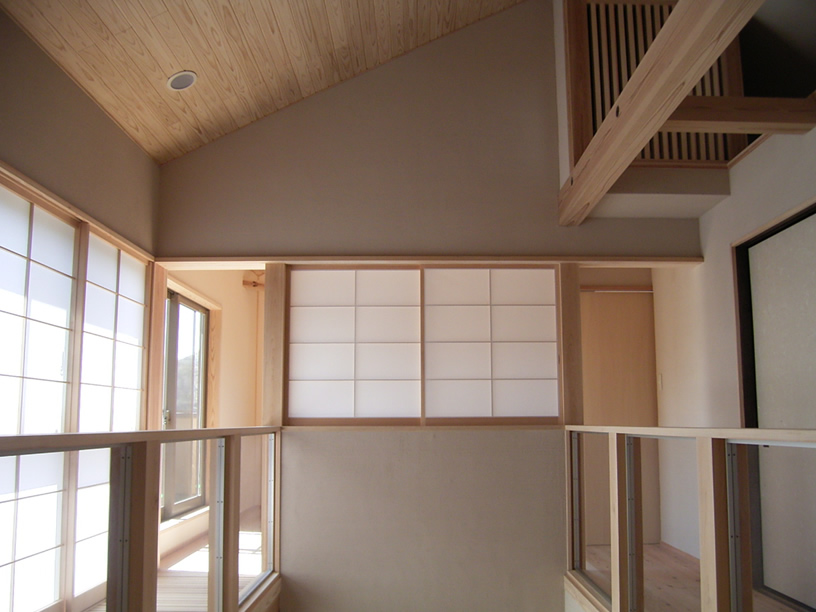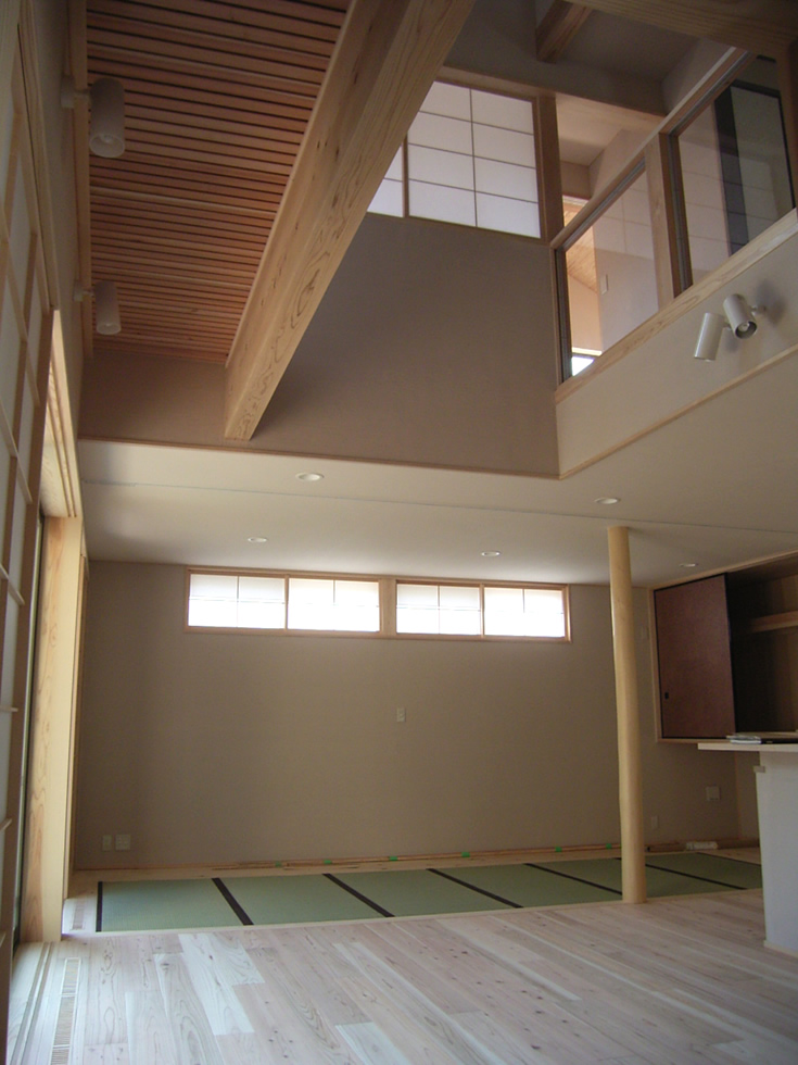 また、敷地形状とご要望を十分に検討した結果、OMソーラー効果を活かした、吹き抜けのあるスキップフロアのプランになりました。玄関からスキップフロアを廻りながら寝室へと移動しますと、家の中をゆったりと回遊しているような感覚になります。