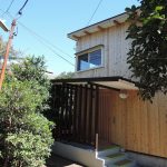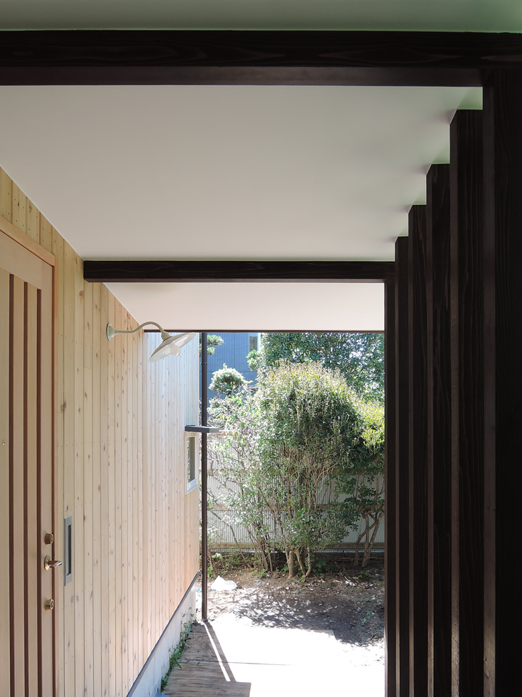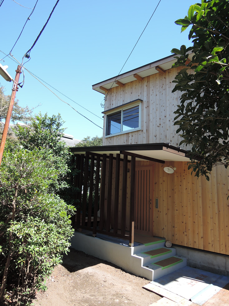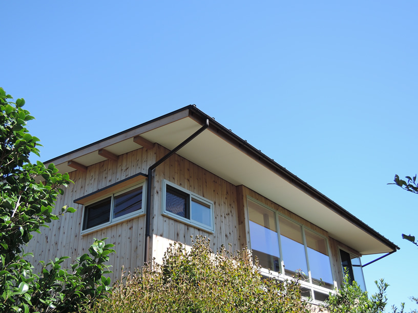 敷地は大磯町東小磯。周囲に緑と古い住まいの残る落ち着いた土地です。周辺の緑にとけ込むように外壁は杉板張りとし、軒を深く出しながら高さを低く抑えています。