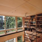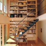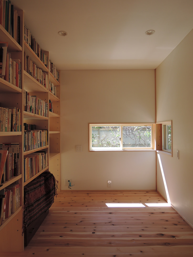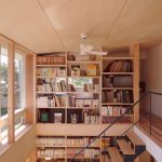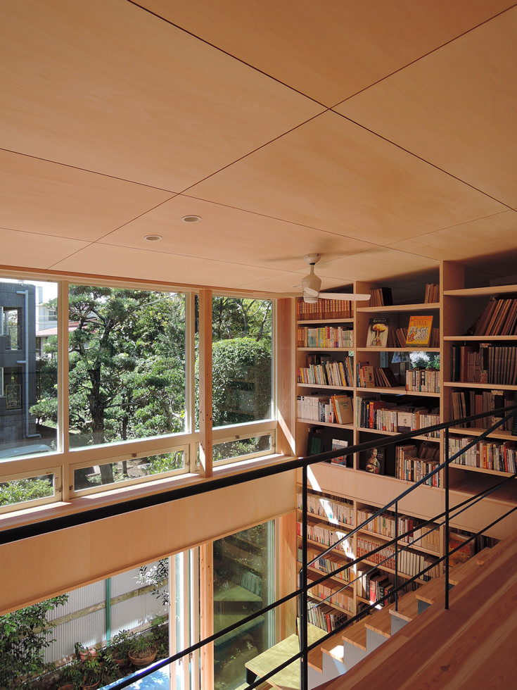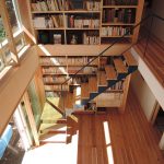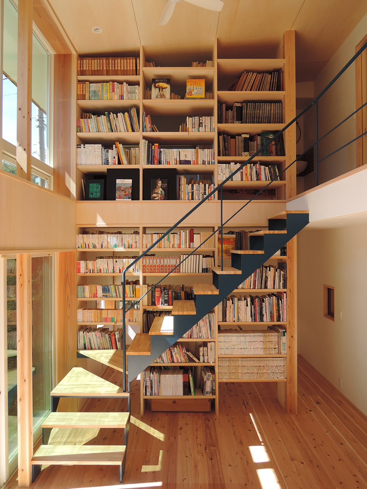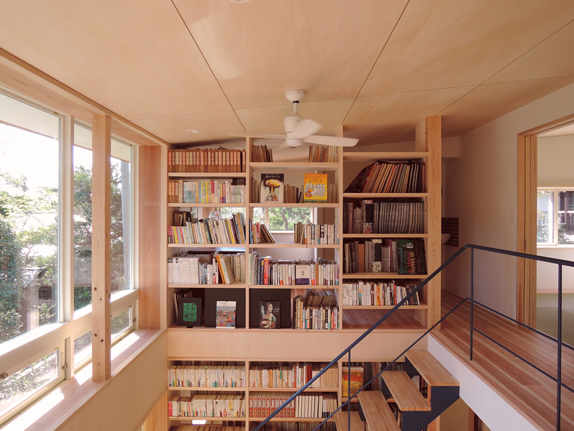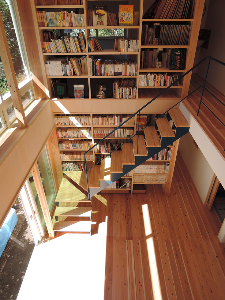 蔵書が多いので、書斎と居間を仕切る本棚を1階から2階まで通し、階段を添わせています。