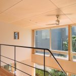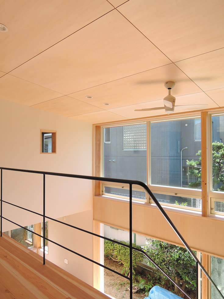 階段は鉄骨階段で仕上げています。高さを抑え、2階の天井高さは低いところで1800mmです(書斎・寝室)。