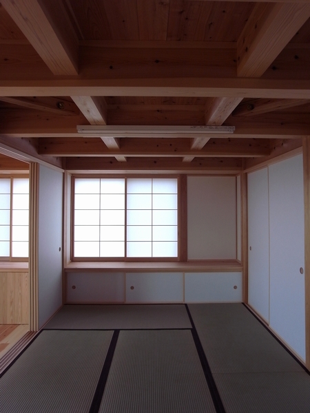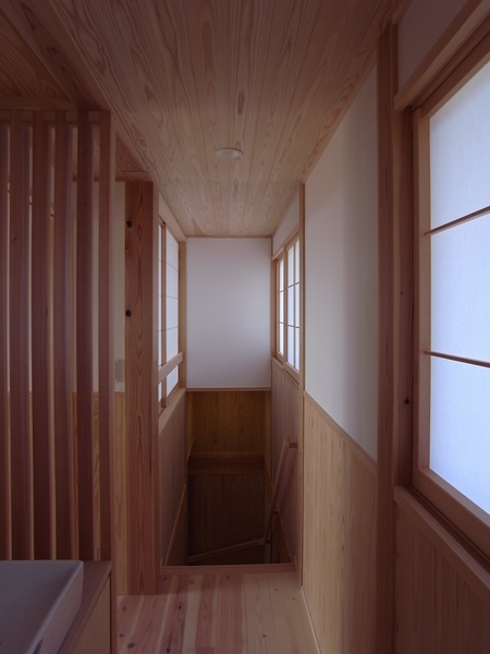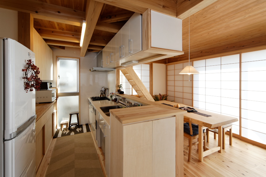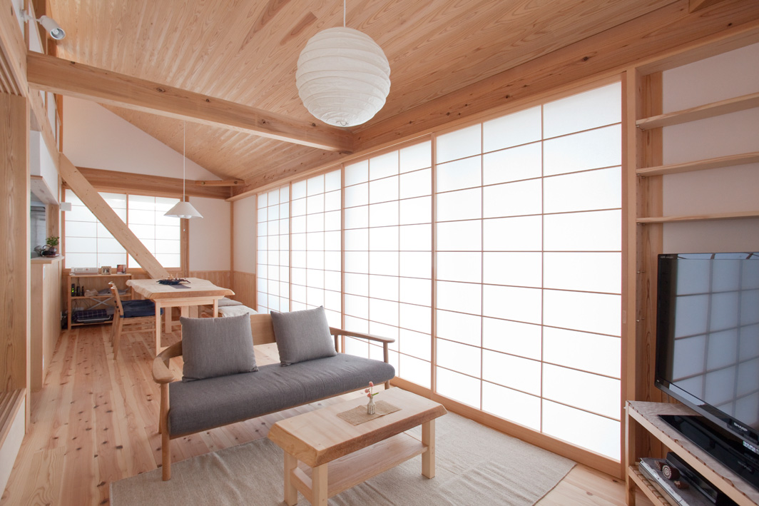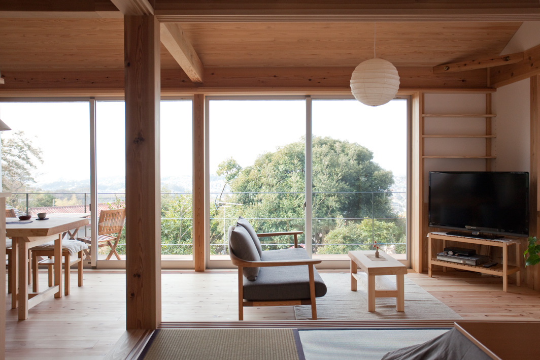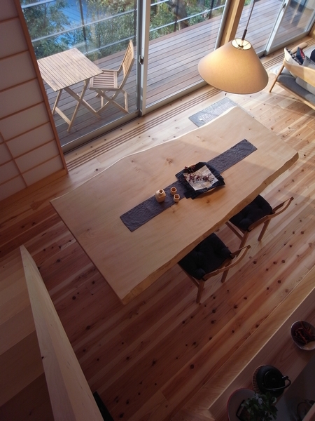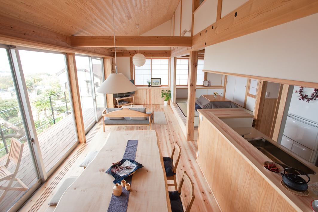 キッチンや1段上げた和室など、どこからでも眺望が楽しめるよう、メインの居間の障子を全開放としています。木製ドアの玄関や杉板張りの階段室など眺望とは反対側の空間も心地良くなるように工夫しています。