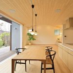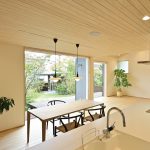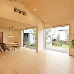 LDKはアイランドキッチンとリビング・ダイニングの一体空間で、リビングは平屋として、勾配天井として豊かな大空間としています。構造的にも、LDKの空間を無柱にする為、2階梁組をトラス組みとしています。
