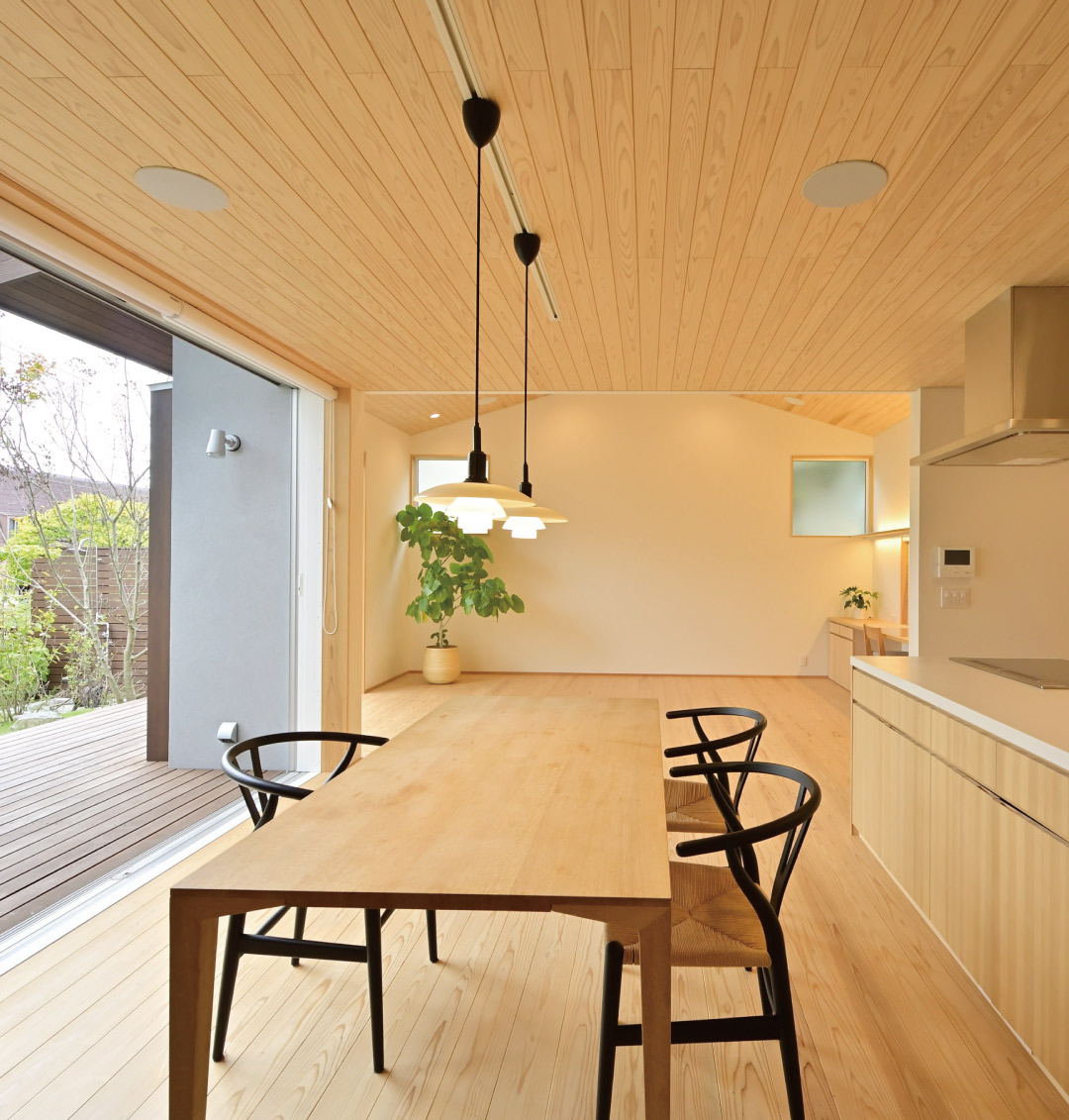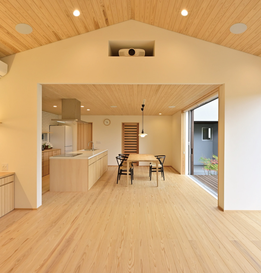 LDKはアイランドキッチンとリビング・ダイニングの一体空間で、リビングは平屋として、勾配天井として豊かな大空間としています。構造的にも、LDKの空間を無柱にする為、2階梁組をトラス組みとしています。