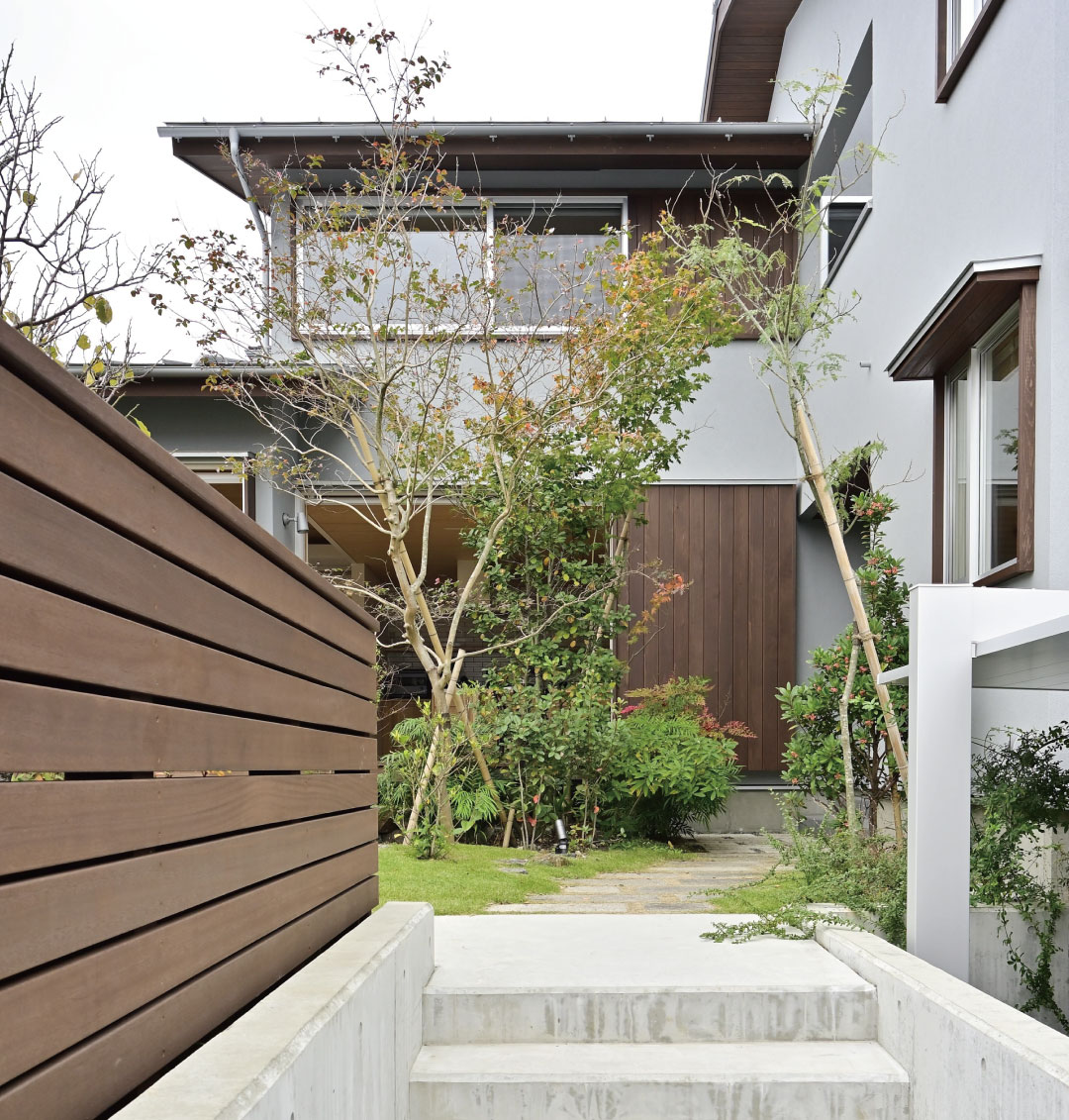 敷地は、鎌倉市七里ガ浜の静かな住宅地にあります。建物の配置は、既存駐車場・眺望の方向・ご要望・隣地との関係から、南西に庭を、東側に玄関・在宅ワーク室・バルコニーを張り出した、L字型のプランとしました。
