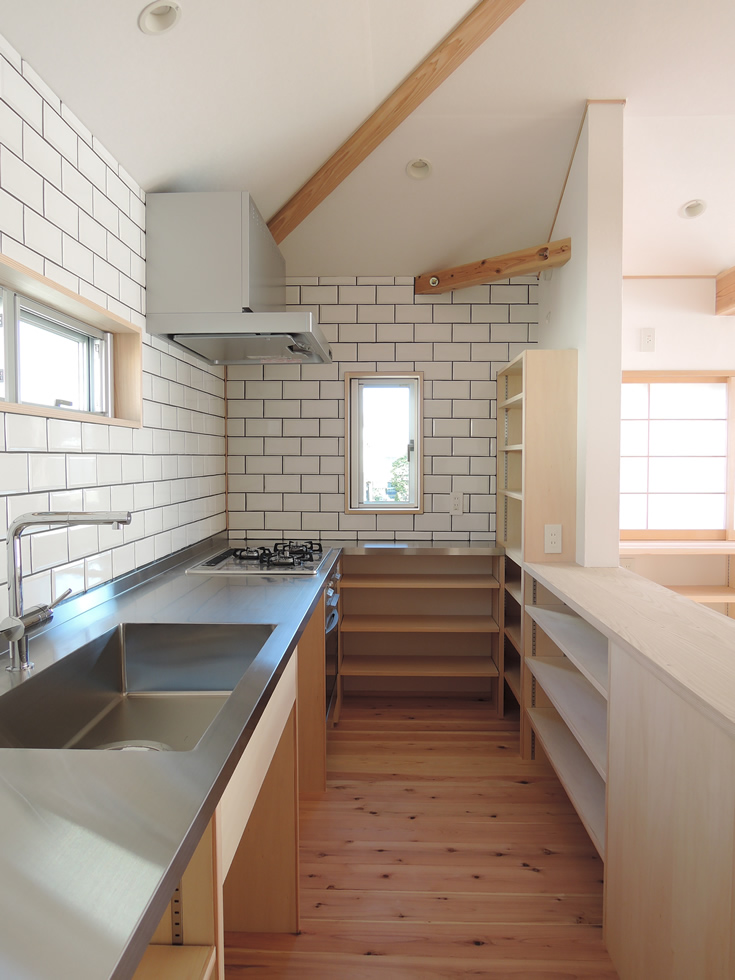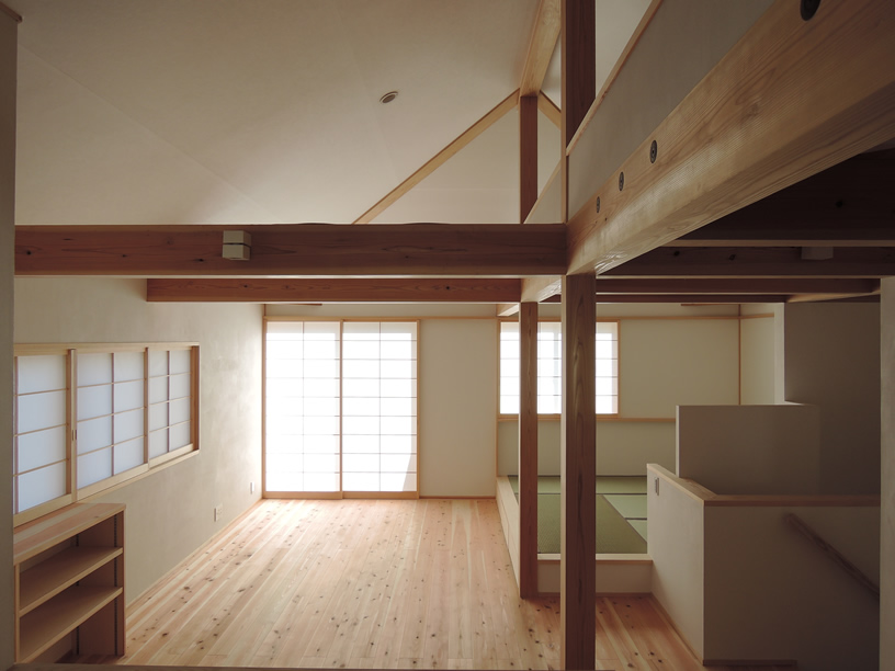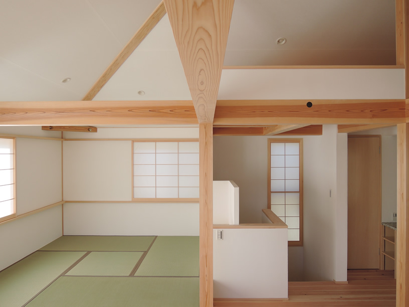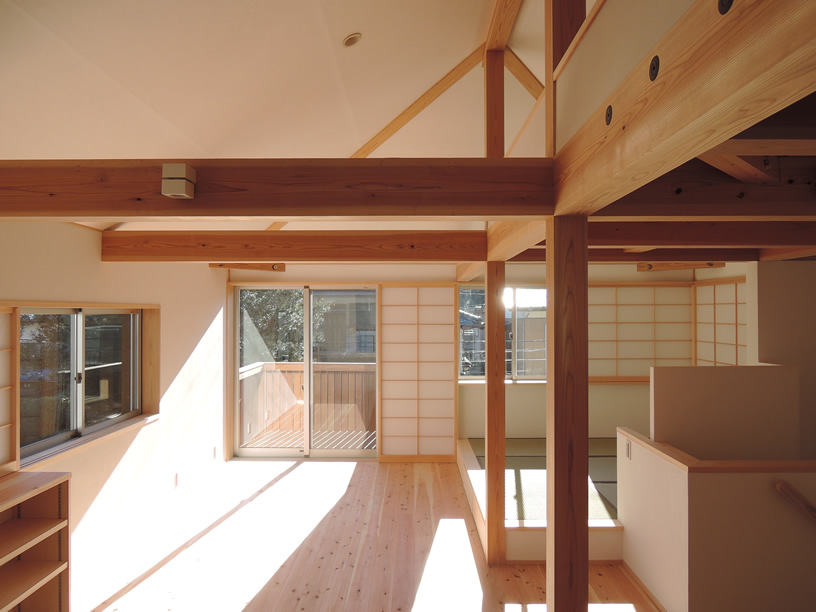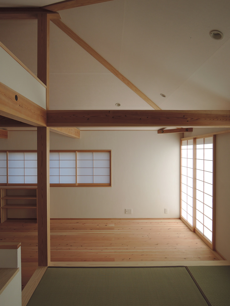 小さいながら、2階居間、寄棟の架構表し、障子引込、R開口…など、たくさんの要素が詰まっています。