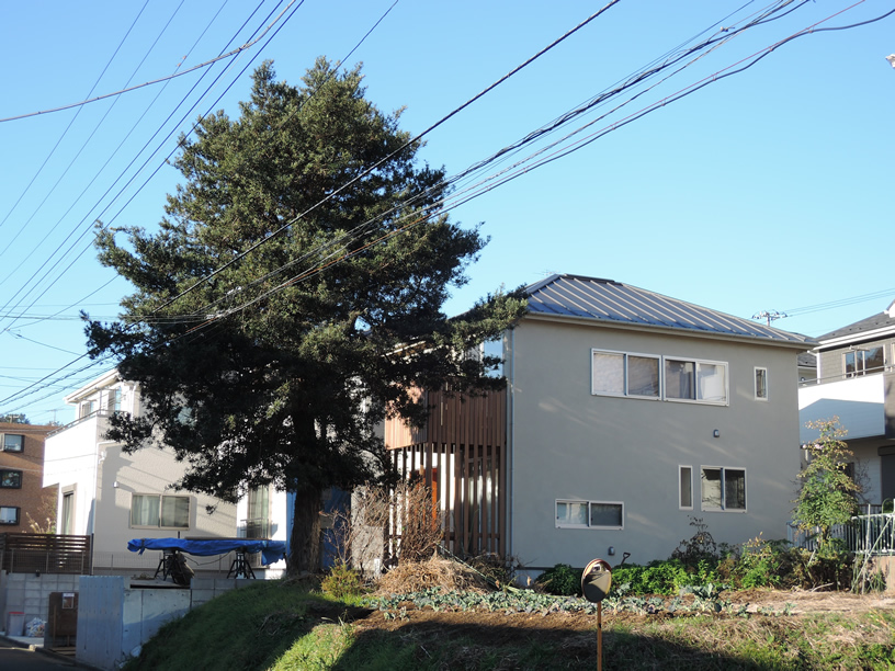 敷地は前面道路から1m程上がっています。東側に畑が広がり、南東側に大木が根付いています。