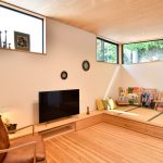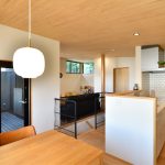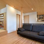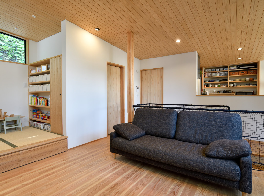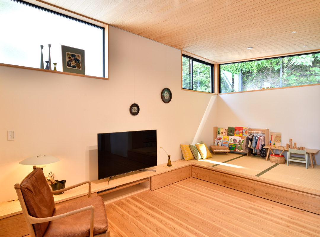 1階は、アプローチ・玄関は思い切って奥に配置、寝室、子室を南側にしています。建物の平面形を、敷地に沿ってL字型に、ダイニングを道路側の抜けの方に、リビングを森の抜けの方に、階段を真ん中に配置し、緩くLDを区切ってくれます。