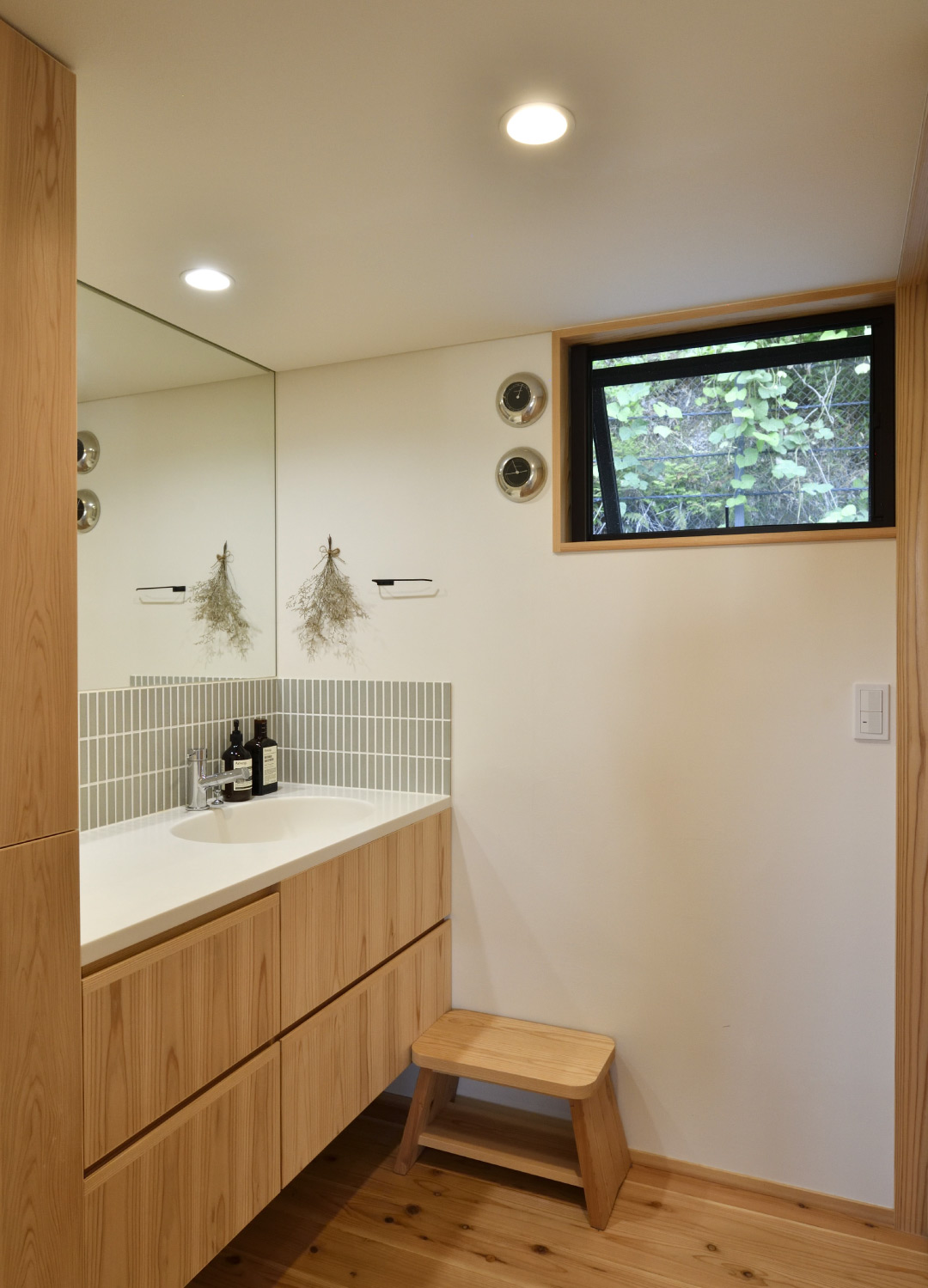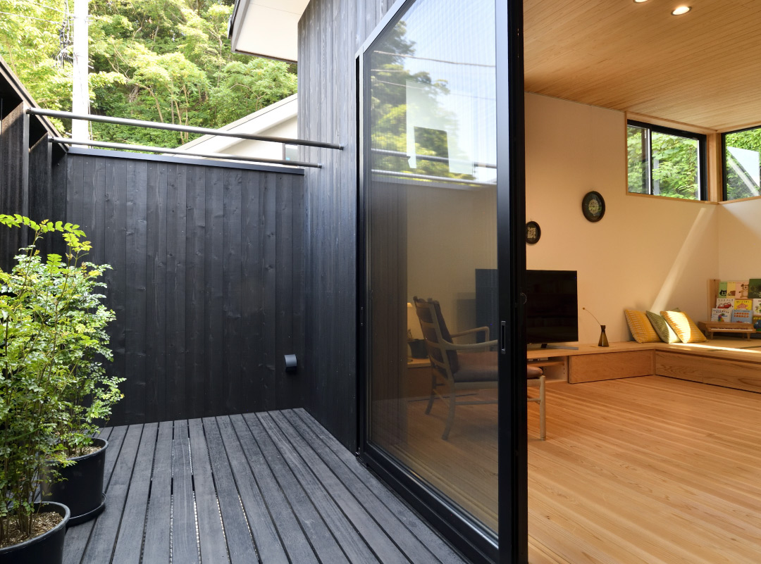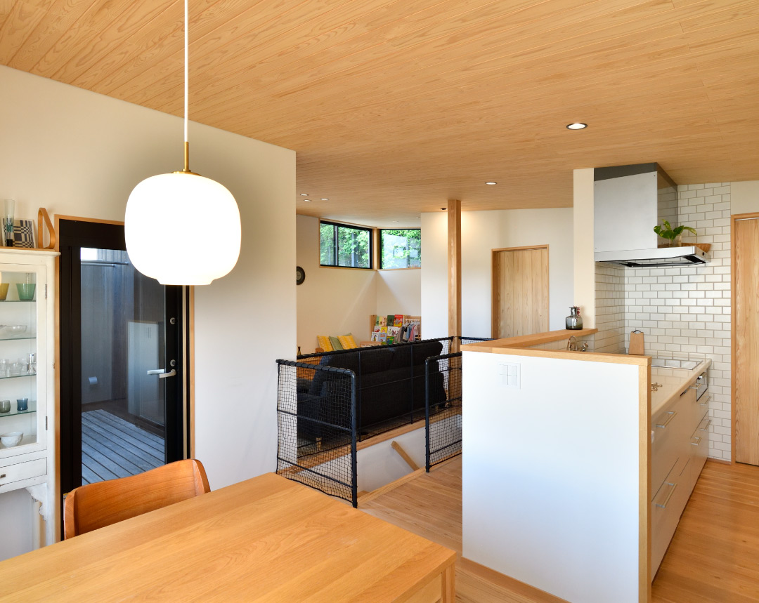 水回りは北側に森を眺められる位置に、1階の北側は土間収納を設えました。敷地の特性を読み、L字プランにして、それぞれの方向へ、抜け感を生かした住まいになったと思います。