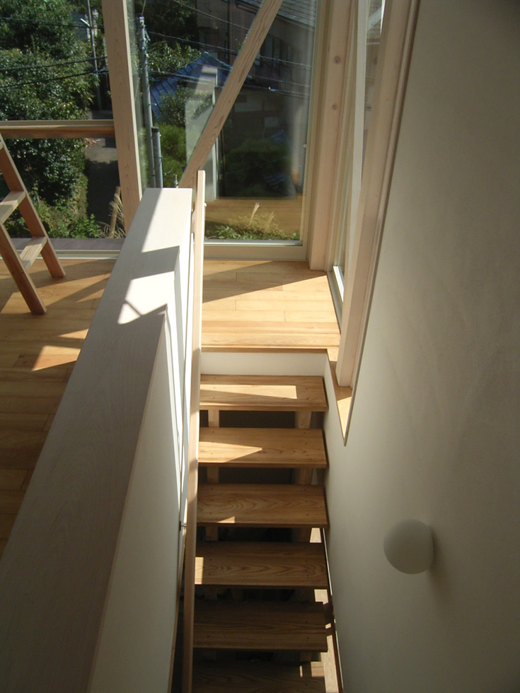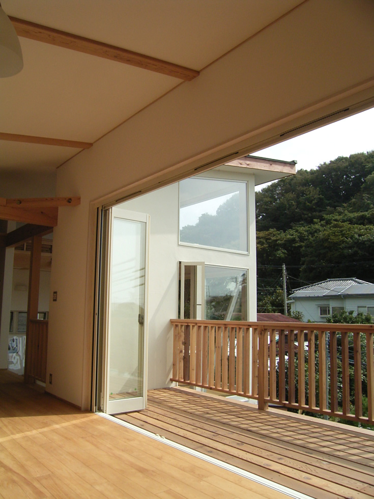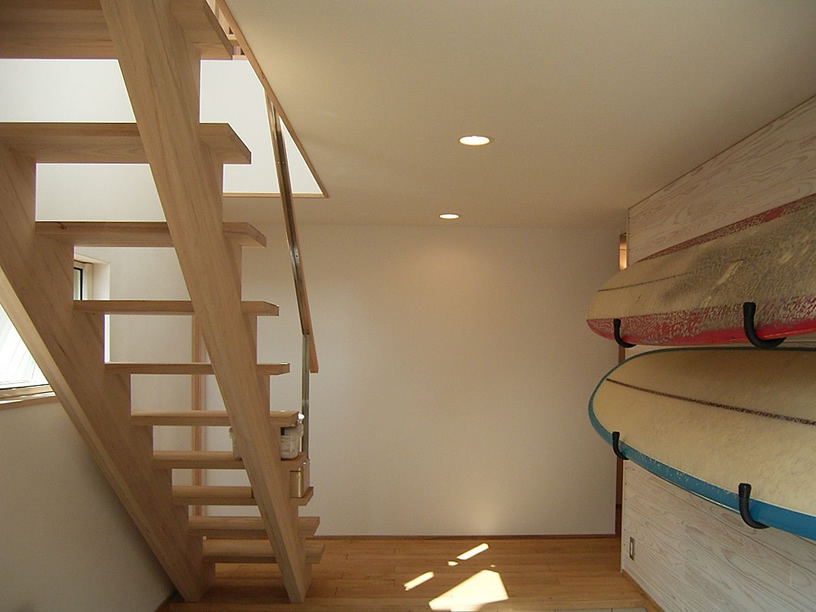 鎌倉の稲村ヶ崎の敷地は、周囲に昔ながらの路地が多く残っています。敷地もその一画にあります。周囲がとても静かで海、山の景色も楽しめる、また、趣味のサーフィンと住まいが直結するようなL字型のプランを考えました。