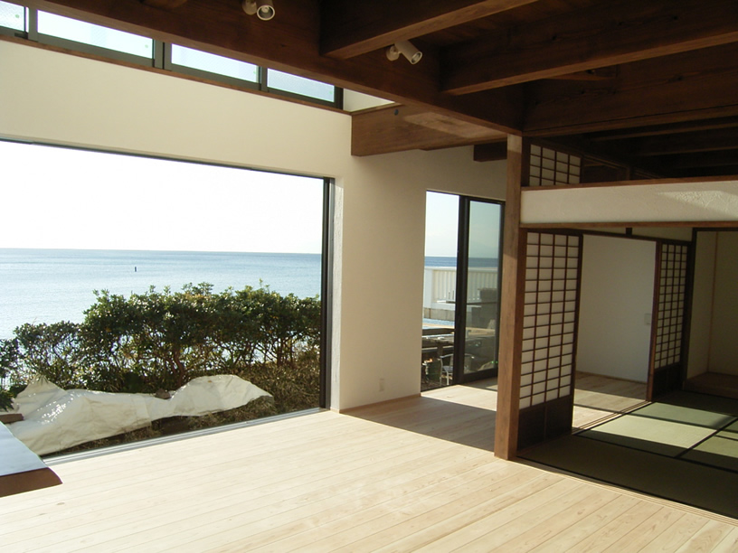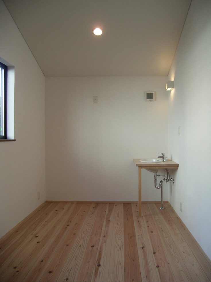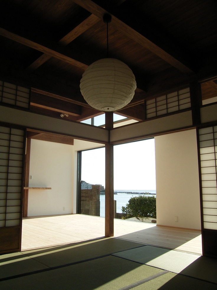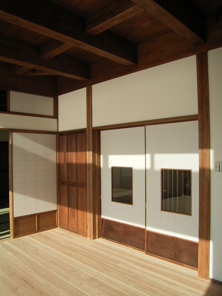 内部空間は床壁天井を杉板張りとして暖かみのある空間になっています。2階リビングは、キッチンからデッキにかけて連続するよう、シンメトリを意識してデザインしました。