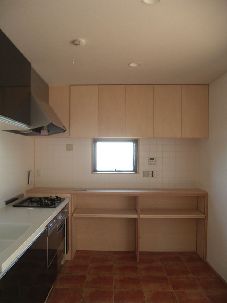 家具も全て大工さんの製作です。床材をそのままカウンターに利用しています。キッチンのステンレスカウンターの長さは4mもあります。