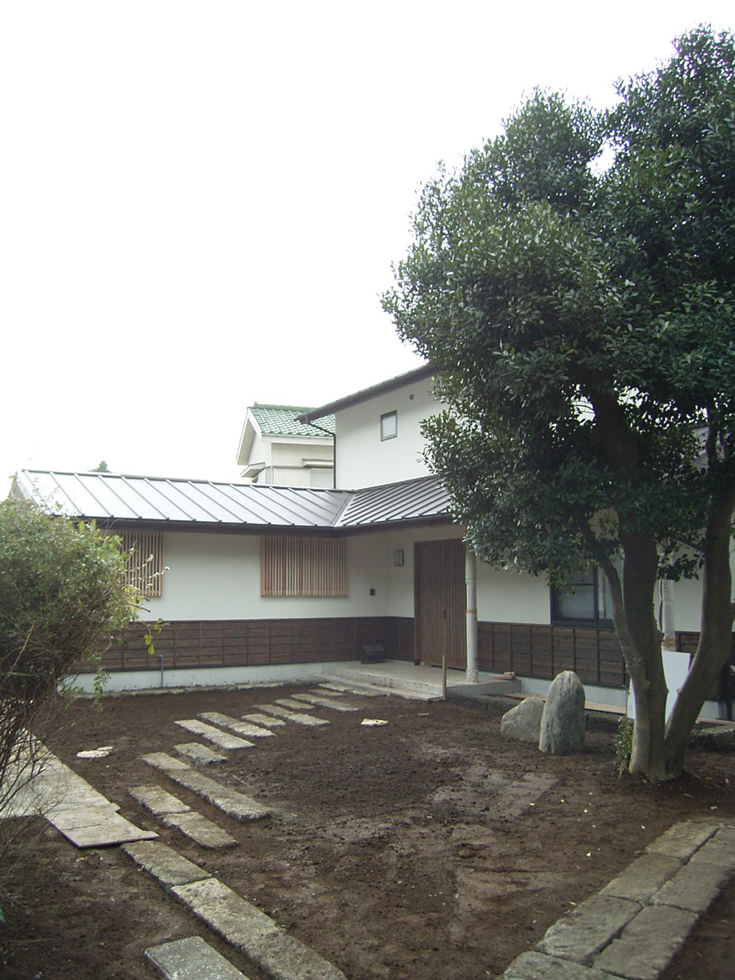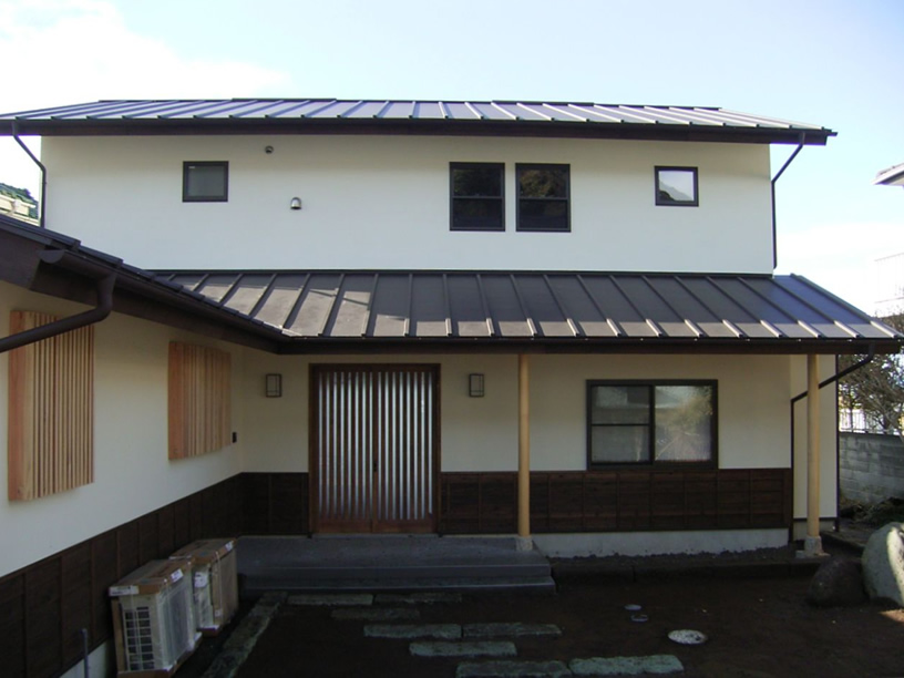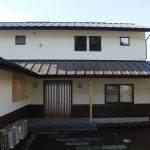 外壁はダークグレーのガルバリウム角波張です。12畳の大きなデッキが張り出しています。
