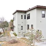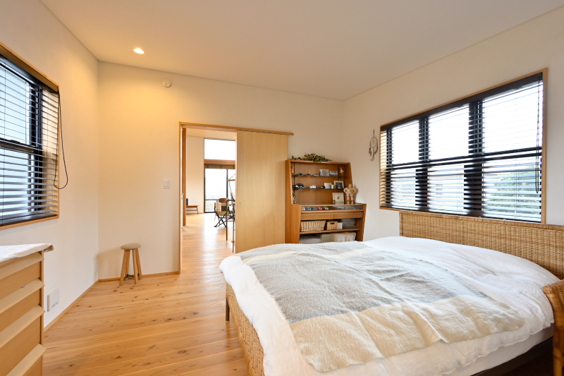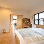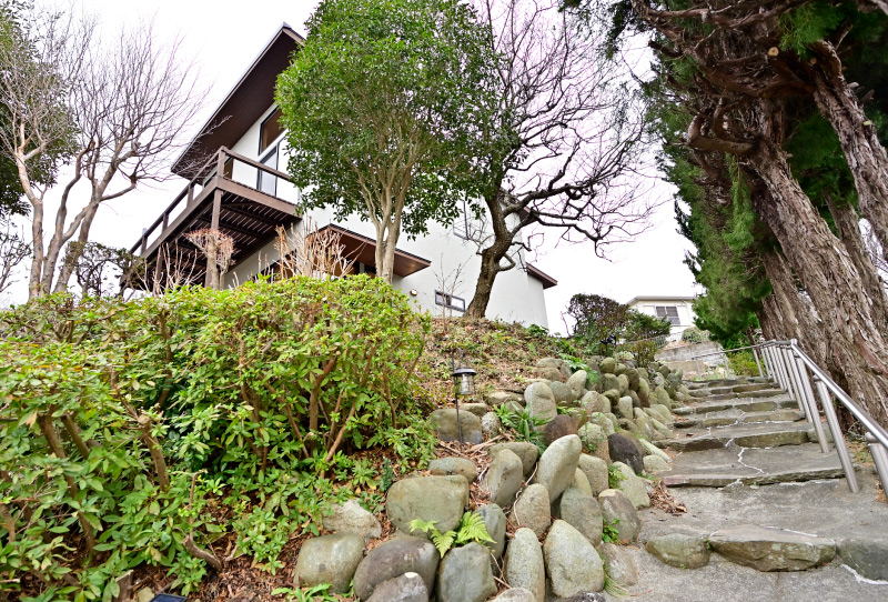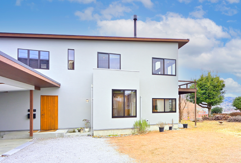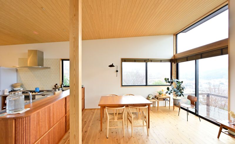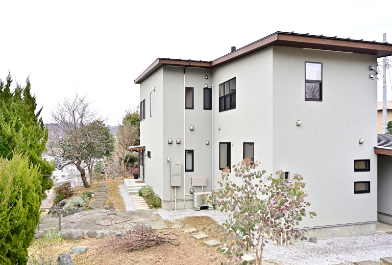 二宮の高台の住まいです。東西北に素晴らしい山並の景色が広がります。風景を取り込む様に、プランはコーナー窓をめいっぱい計画しました。屋根も景色の方に向かって広がる片流れ屋根としました。
