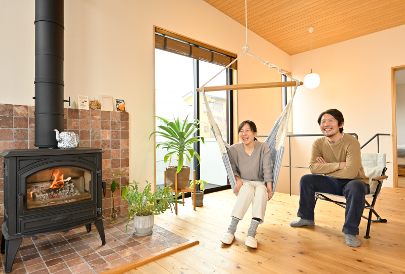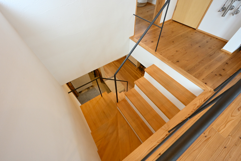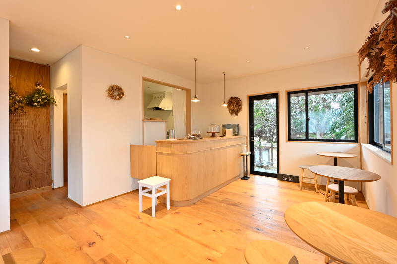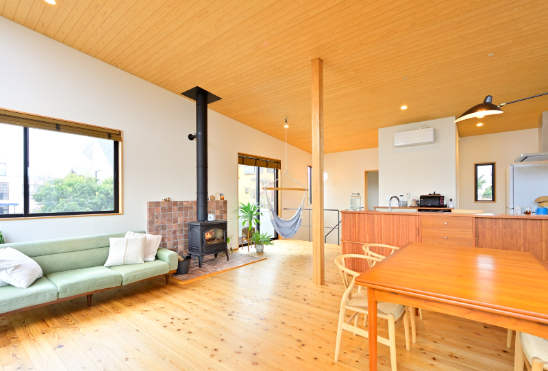 1階にはご要望のカフェとゲストルーム、屋根のあるガレージを計画しています。2階は居住スペースとし、天井も高く高窓のある開放感のあるLDKを作りました。カフェや造作キッチンはお施主様と家具屋さんとの協働となりました。いつもと少し雰囲気の違う加賀妻の家が見れます。