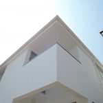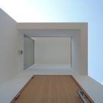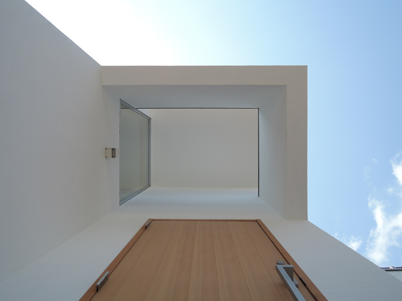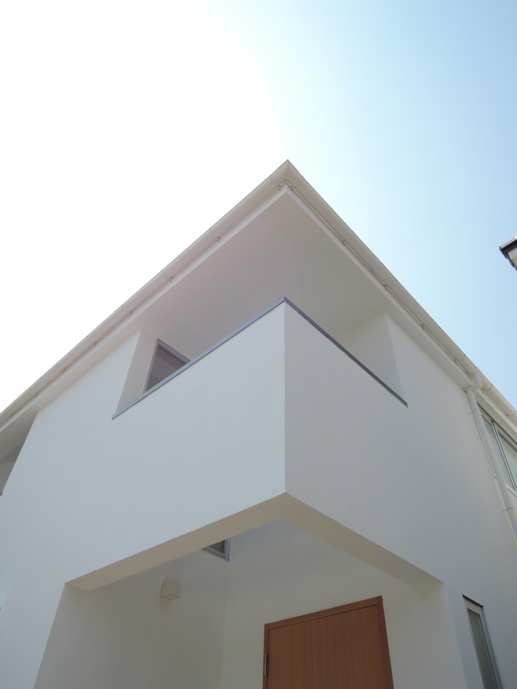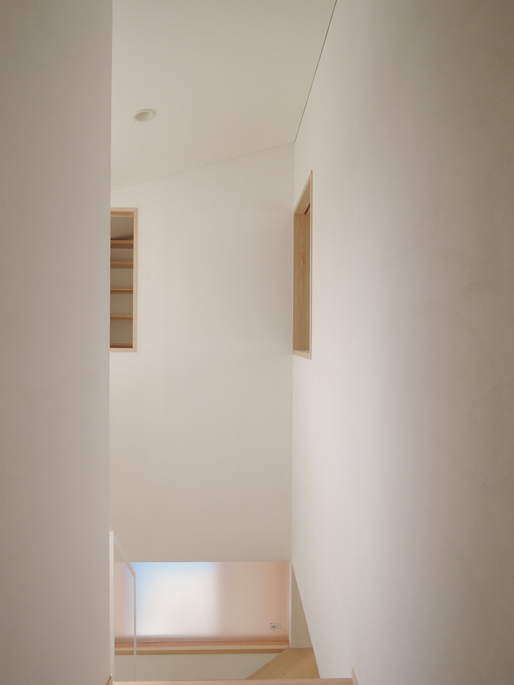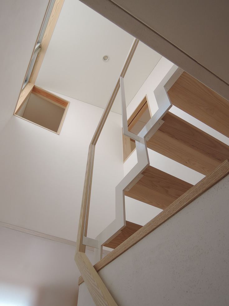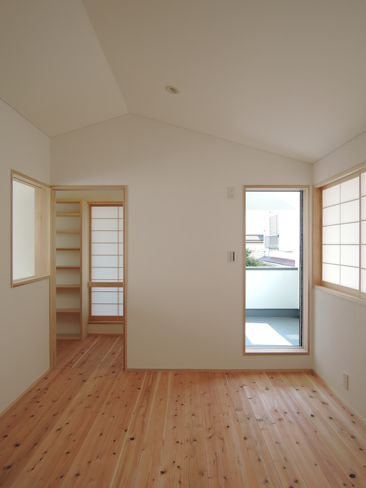 敷地は旗竿の敷地で周囲は住宅で囲まれています。南側の視線の抜けの出来る隣地境界線に向けて、大開口を設け、他の窓は小さく抑えています。
