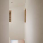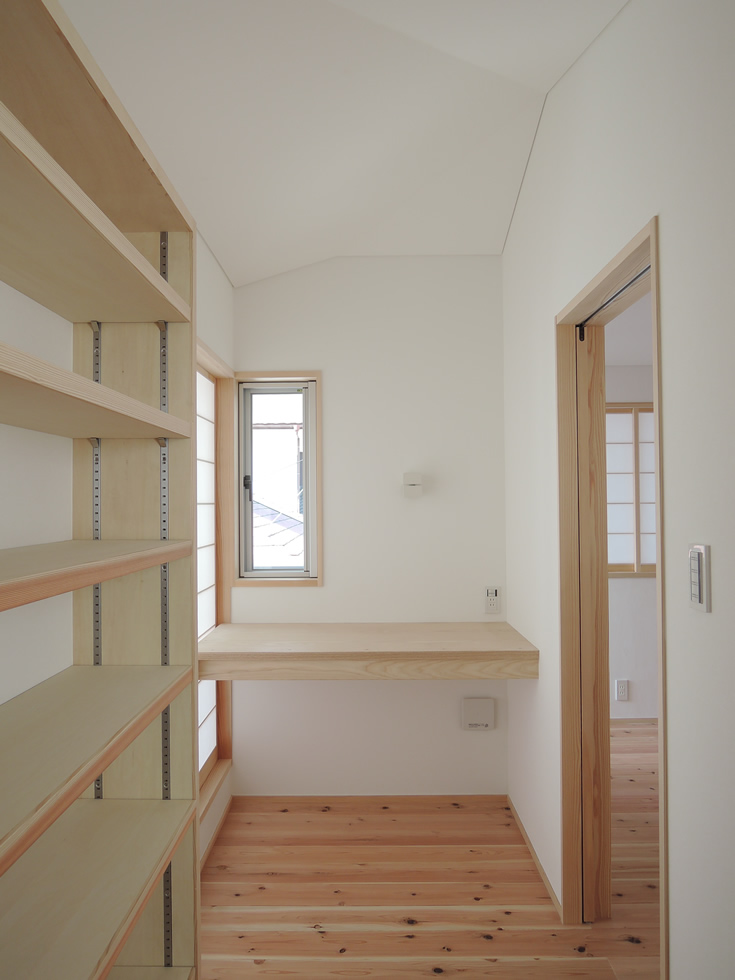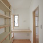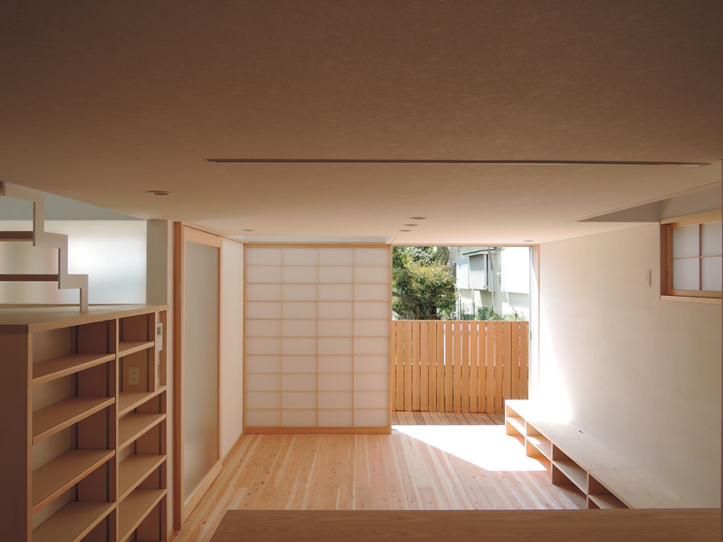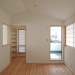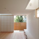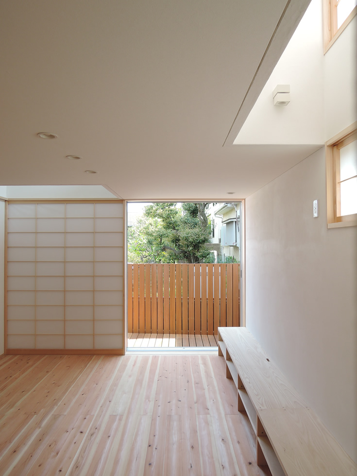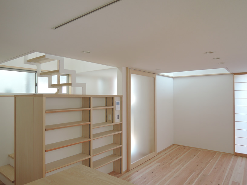 また、日中の明るさを取り入れるよう、東・南・西に一坪より小さな吹抜を設けています。仕上げは珪藻土、厚み30mmの松のフローリング、天井はエコクロスです。