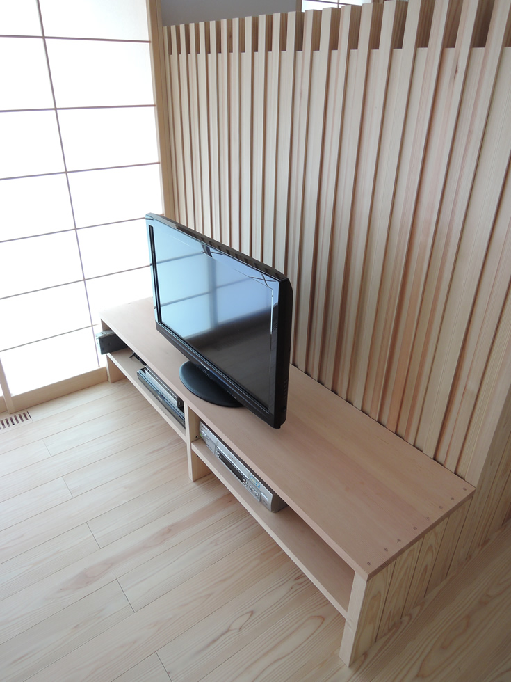 格子の玄関・家具などは、木組みの表情を出来るだけ豊かにみせるように考慮しました。白い珪藻土の左官仕上げ、着色をせず仕上げた杉の色、格子の陰影の融合する仕上がりになりました。
