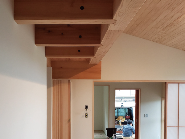 大屋根を生かした杉板張りの天井に加えて、