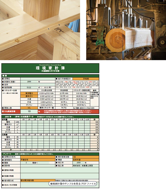 さらに、お引き渡し後の年間の電気・ガス・水道・光熱費の使用量を「環境家計簿ソフト」に入力することにより、実際の家庭全体のエネルギー削減率・CO2削減率を算出することができます。これも住まい方により大きな差が出ますが、これにより設計時レベルと実際の状況の比較ができ、より具体的な住まい方の提案も可能になってきています。