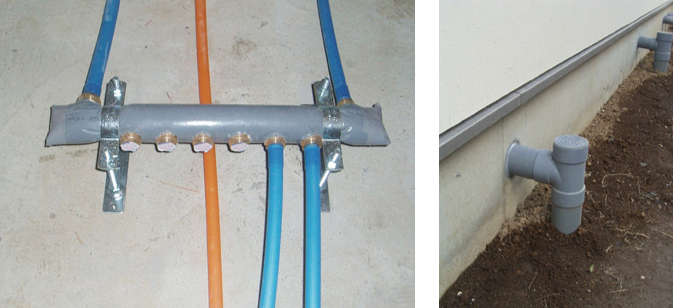 建物の点検・清掃・補修を行う維持管理と水漏れ対策の考え方から、給水ヘッダー配管方式を採用し、排水管をコンクリート内に埋め込まないことにしています。また、基礎の立ち上がりを地盤面から400mmとし、床下のメンテナンスを容易にしています。